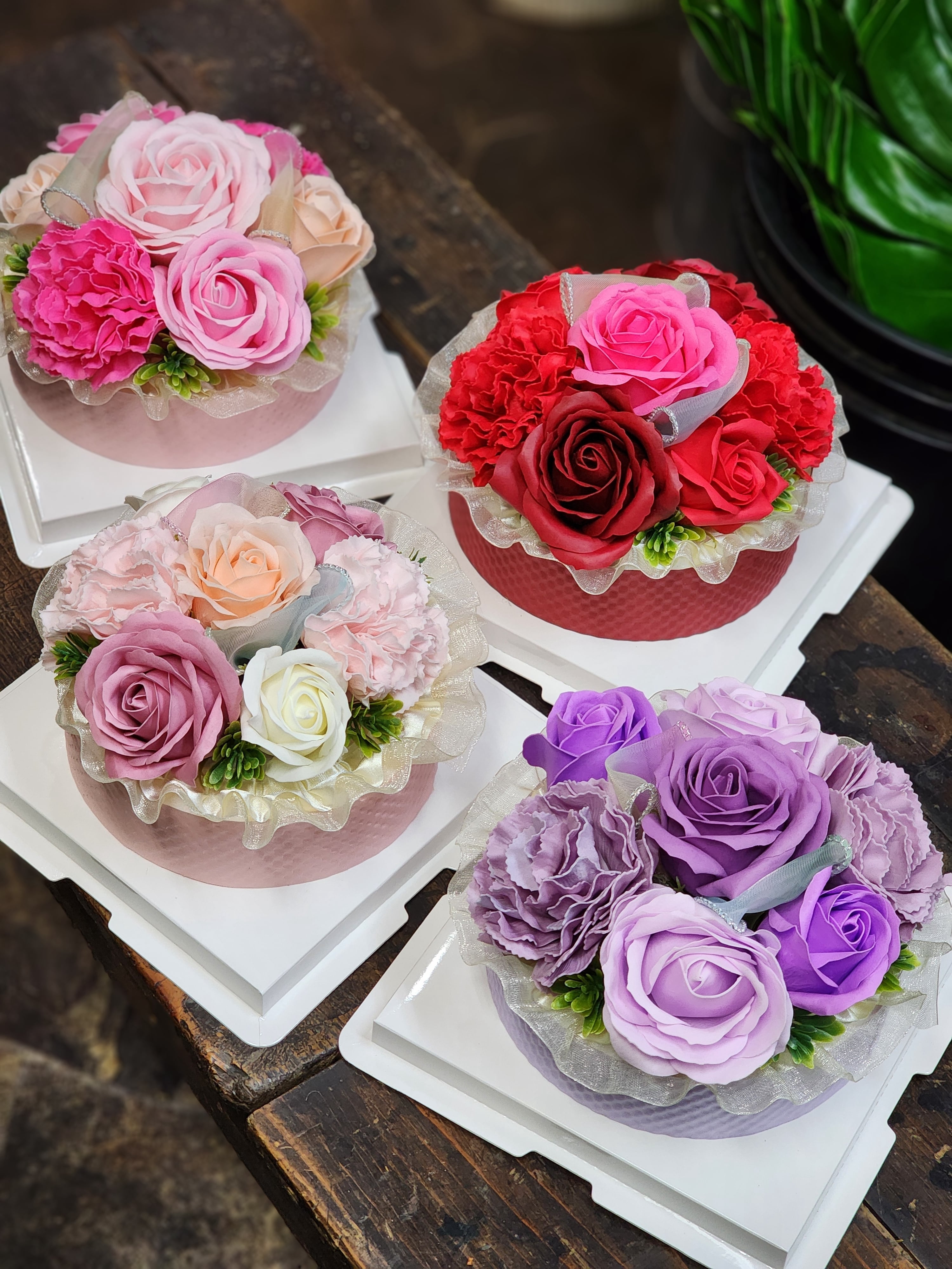 フラワーケーキソープフラワーは、まるで本物のケーキのように華やかにデコレーションされた観賞用のソープフラワーです。美しい色合いと精巧なデザインが特徴で、ギフトとして贈るだけでなく、自分へのご褒美にもぴったりのアイテムです!
