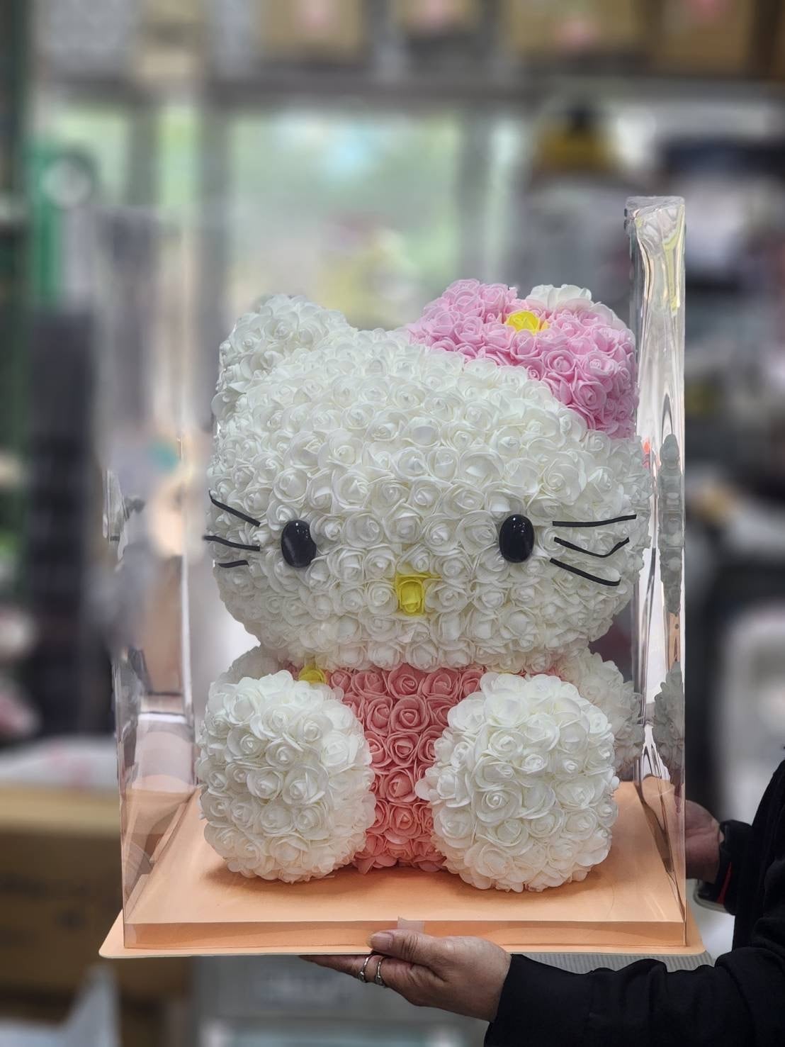発泡ウレタンの小さなお花で作られた、キティちゃんです。 大きな大きなキティちゃん、 クリアケース入りです。 ケースサイズ 横40センチ×高さ50センチ×奥行き40センチ